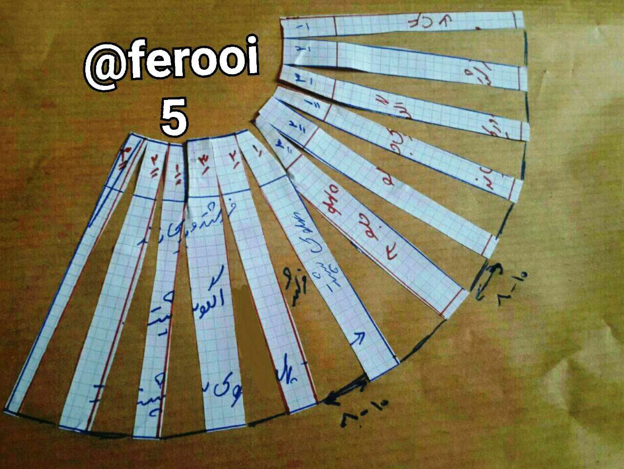 تقسیم بندی می کنیم قسمت جلو و پشت الگو یه ی دامن و 6 تکه در جلو و 6 تکه قسمت پشت دامن را تقسیم می کنیم و برش می زنیم تا نزدیکی خط کمر و اوزمان می دهیم .