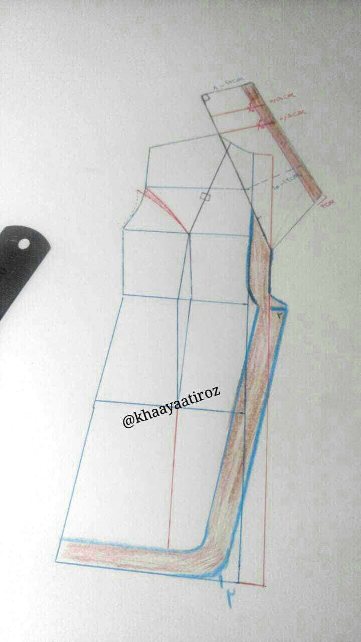3 سانت جادکمه می کشیم، بعد از بستن پنس لقی یقه خط شکست را می کشیم و خط شکست را به اندازه ی یک دوم هلال پشت یقه منهای 1 بالا ادامه می دهیم.