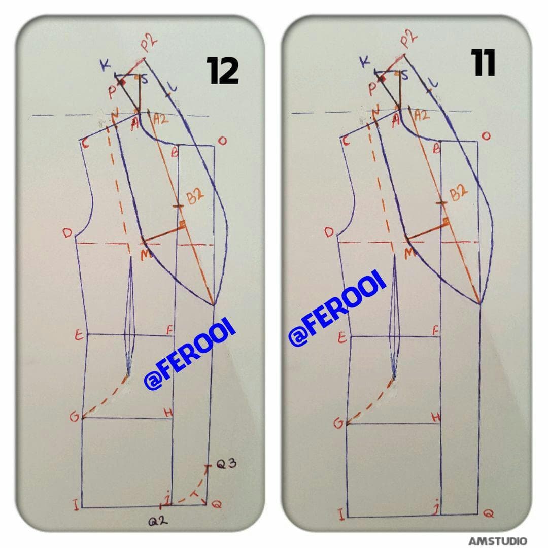 سپس از O به P و به Q متصل کنید.دکوپ الگوی پشت را نیز دکوپ 1/2سرشانه رسم کنید و از پایین پنس نیز به لبه پالتو یا مانتو خطی عمود کنید.