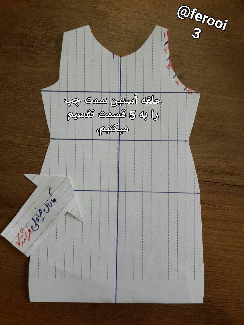 حلقه آستین را 5 قسمت کرده و از یک پنجم بالایی به زیر بغل در طرف مقابل وصل می کنیم و از یک پنجم پایینی به وسط کمر.