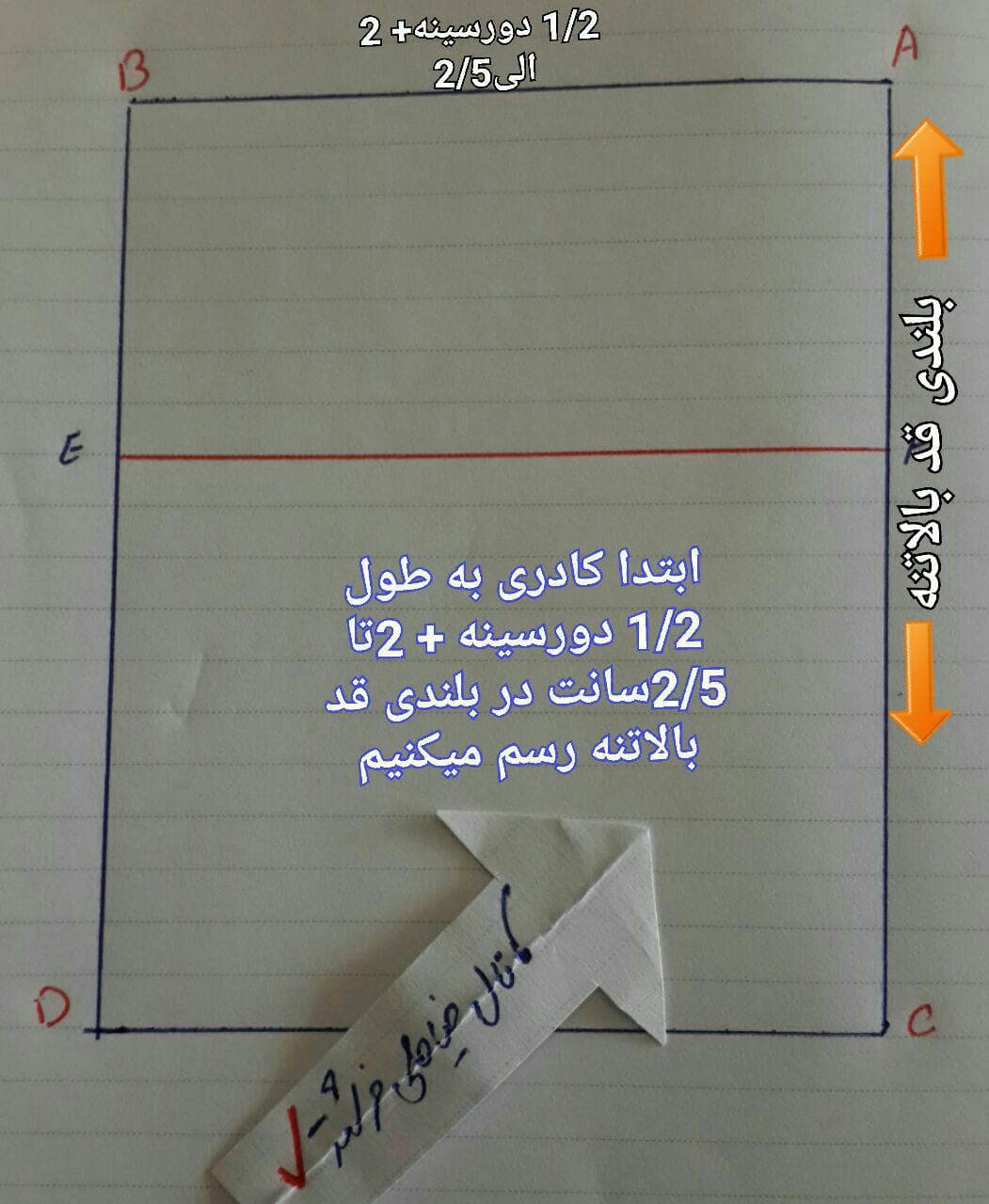 از نقطه ی E به اندازه ی 1/2 کارور پشت به اضافه نیم سانت جلو می آییم و 'E را علامت زده و از 'E یک خط صاف میکشیم به بالا و "E بدست می آید.