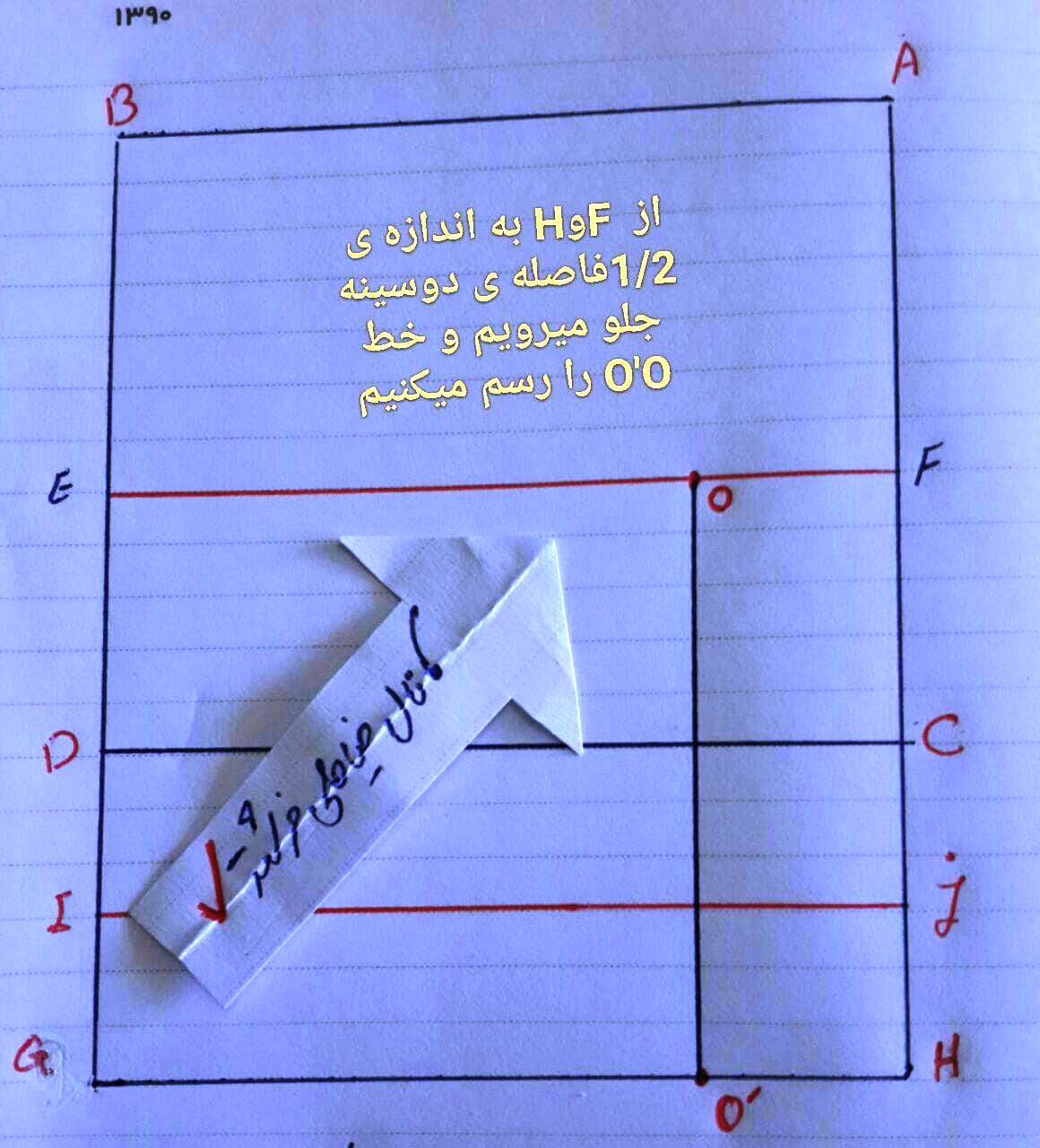 از نقطه ی D به اندازه ی 9 سانت که عدد ثابتی هست جلو رفته و نقطه ی ج را علامت میزنیم بعد به اندازه ی 3 سانت جلو رفته نقطه چ را علامت میزنیم و وسط ج چ را بدست آورده و نقطه ی P می نامیم.