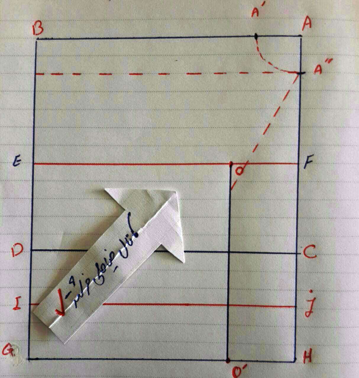 و از A به اندازه ی 1/5 گردن به اضافه ی نیم سانت پایین آمده و گردی یقه را رسم میکنیم.