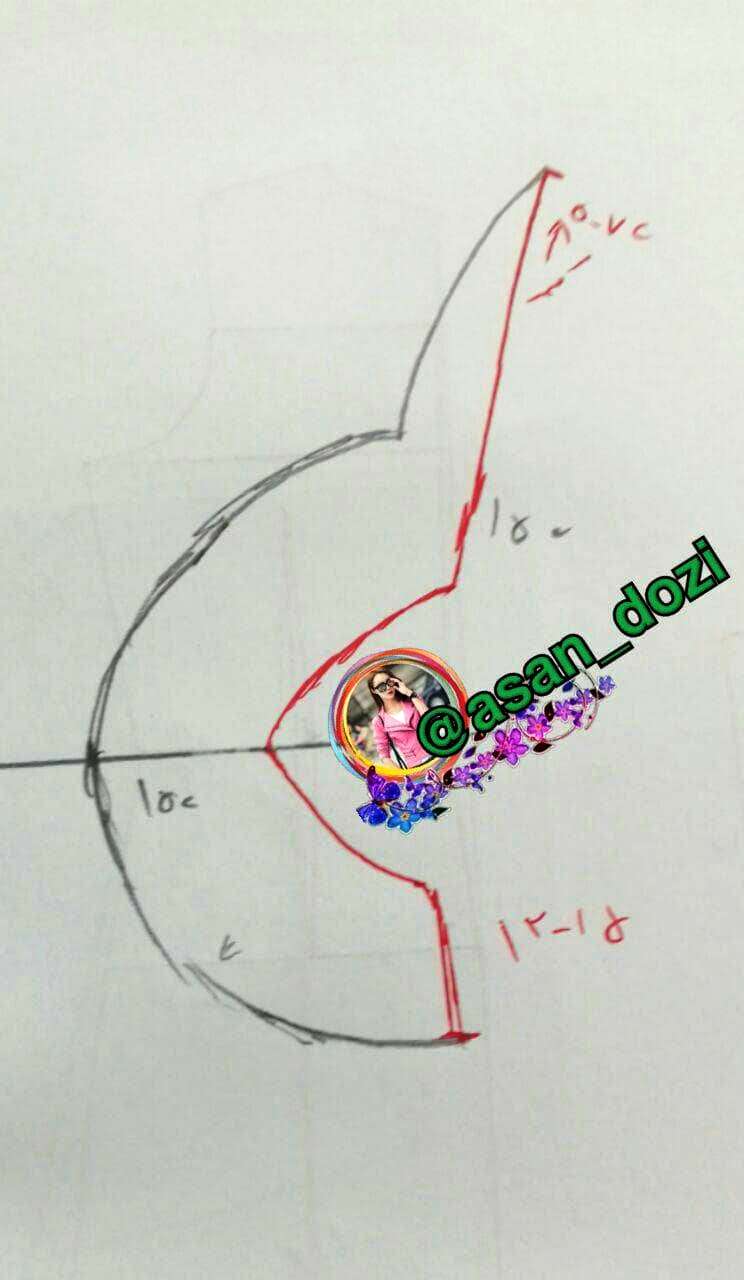 از وسط جلو ۱۲-۱۵ سانت از سرشانه و وسط پشت ۱۵ سانت جلو رفته خط کمر پشت ۵-۷ سانت پایین رفته و مانند شکل نقاط را بهم وصل کنید .