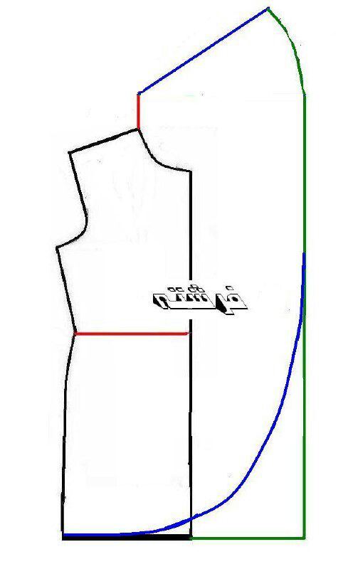 ابتدا الگوي اوليه رو در بياوريد، از كنج يقه به اندازه 1/2 پشت يقه بالا برويد و از انجا عمود 20 تا 25 سانت بيرون برويد {پهناي يقه دلخواه }و از لبه ان به صورت عمود تا لبه مانتو بياييد.
