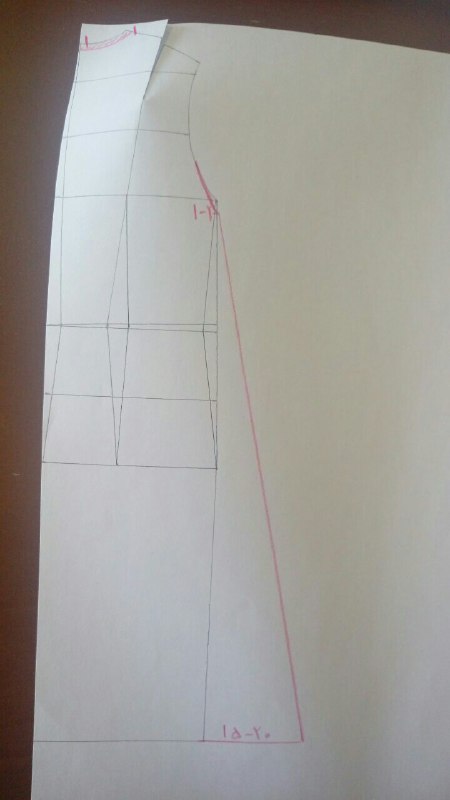 ۴۵ الی ۵۰ سانت از خط کمر پایین آمده و خطی رسم می کنیم. کل الگو را به جز جاهای هاشور خورده کپی می کنیم.