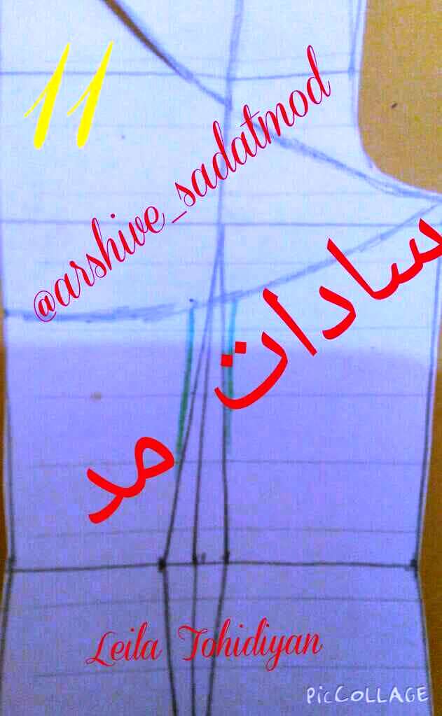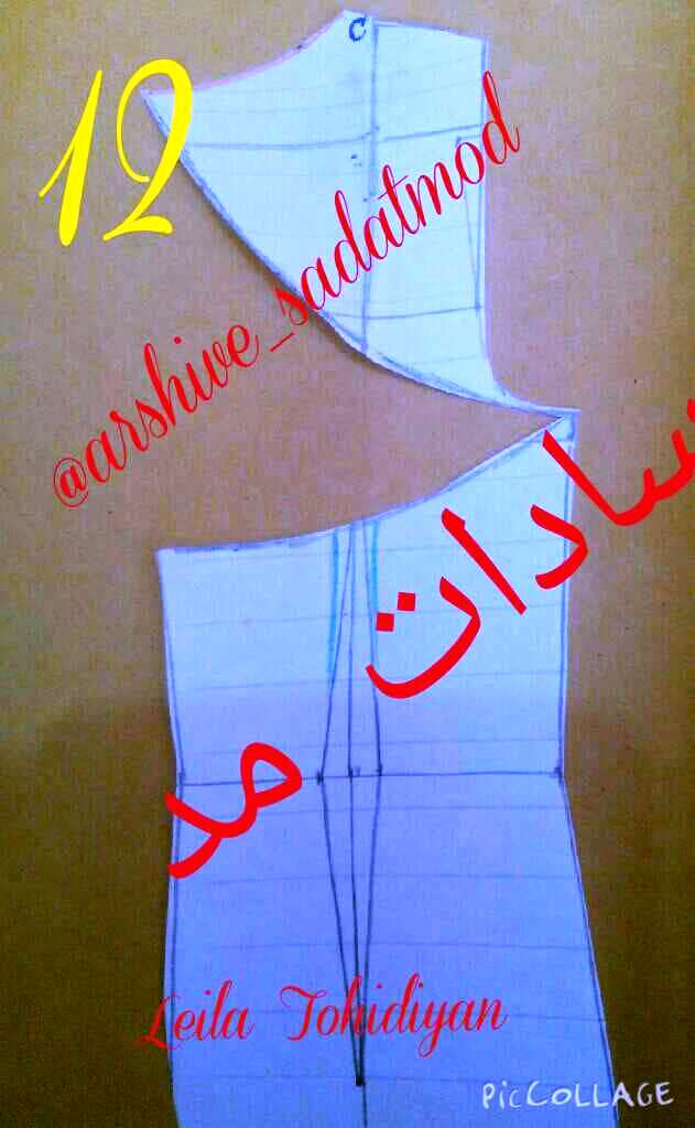 برای پشت هم از b که نقطه گشاد شده یقه هست خط کمکی پشت را به ۰/۵ سانت پایین تر از هلال یقه پشت بر روی خط وسط پشت پایین می آییم و بر b عمود بر خط کمکی رسم کرده روی آن عمود بلندی یقه را بالا میرویم (عکس شماره 1)